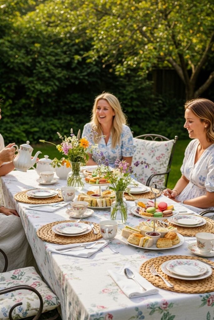 Transform a quiet backyard into a dreamy escape with vintage floral tablecloths and mismatched china cups. You can hang ribbons or lanterns from the trees to make the space feel like a hidden sanctuary. Serve a variety of herbal teas alongside tiny finger sandwiches and fresh scones with cream.